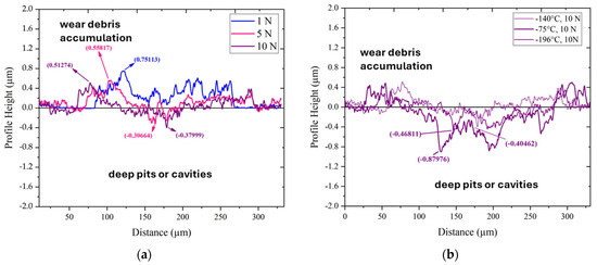 Topographic details of worn surfaces of the CT140170 specimen acquired by confocal microscopy: (a) wear profiles as a function of applied load and (b) wear profiles as a function of applied treatments at 10 N.