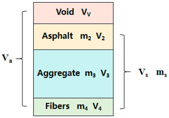 Here, is the mass of the asphalt (g), is the mass of the aggregate (g), is the mass of the fibres (g), is the total mass of the asphalt mixture (g); is the void volume (cm3), is the volume of the asphalt (cm3), is the volume of the aggregate (cm3), is the volume of the fibre stabilizer (cm3); is the total volume of the asphalt mixture (cm3), and is the real volume of the asphalt mixture (cm3). According to the mechanical theory of granular materials, the following relationships can be defined as follows: