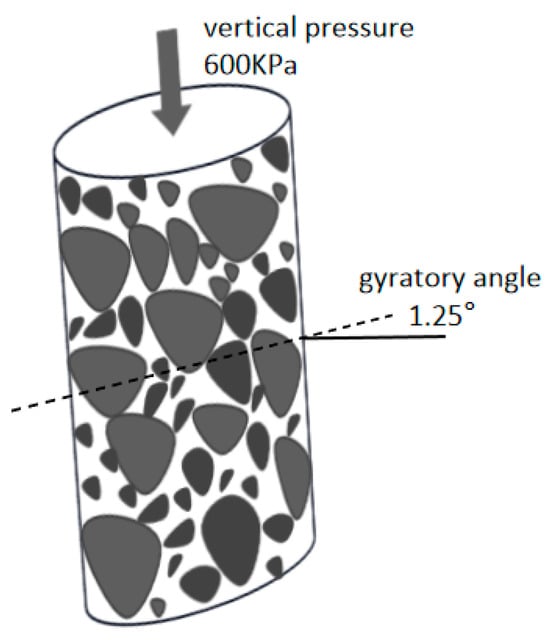 The basic principle of the SGC compactor: the specimen is slowly compacted under the vertical pressure of a loading head of 600 KPa. Its movement axis is like a cone, with its apex coinciding with the top of the specimen. The rotating base positions the test mould at 1.25°. The gyratory compaction angle rotates at a constant speed of 30 r/min. The loose asphalt mixture is simultaneously affected by vertical pressure and horizontal shear force in the test mould, causing the particles to move directionally to form a dense skeleton structure. The gyratory compactor and its working principle are shown in Figure 2 and Figure 3.