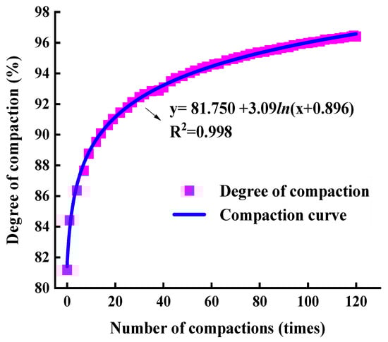In the SGC test, the bottom and sides of the mould have lateral and vertical constraints on the asphalt mixture, but there is no constraint on the top. Therefore, according to Equation (8), the degree of compaction during the gyratory compaction process can be taken based on the change in the specimen height. In order to analyse the relationship between the amount of gyratory compaction of the asphalt mixtures and the degree of compaction, a logarithmic function is used to fit the degree of compaction. The compaction curve of the SMA-13 asphalt mixture can be taken as shown in Figure 4.