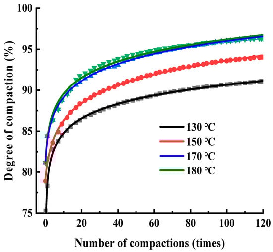 The gyratory compaction curve can better reflect the internal structural characteristics of the asphalt mixture during compaction. The compaction tests of variable temperature involve changing the initial compaction temperature () to explore the changing rules of the compaction degree, structural percentage of air voids, and the friction response between the internal particles. SMA-13 is selected, and the gradation is as shown in Table 6, above. The asphalt is 90# SBS modified bitumen. The optimal content is 5.8%. In order to simulate the aging of the construction process, the asphalt is placed in a high-temperature oven for more than 2 h. The initial compaction temperature of the test is set to 130 °C, 150 °C, 170 °C, and 180 °C, and the number of gyratory compactions is 120 times. Three specimens are taken from each group, and the compaction degree is calculated using Equation (8). The relative error of the compaction degree is less than 0.3%, and the average of the three groups of compaction degrees is taken. Nonlinear fitting was performed based on the SGC logarithmic function fitting Equation (9), and the fitting degree was >99.8%. The compaction curves under different initial compaction temperatures are shown in Figure 7.