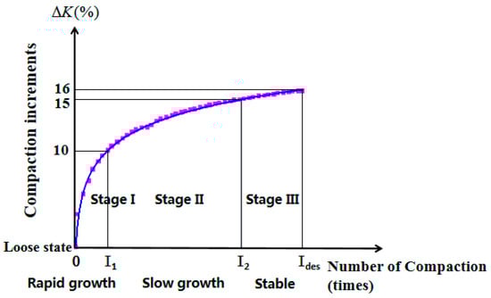 - The compaction process of SMA can be divided into three stages based on the compaction curves rule: Stage I is the rapid growth period, where the compaction degree grows by about 10%, which corresponds to I1 times of compaction, and the interval of the number times of compaction is (0, 20); Stage II is the slow growth period, where the compaction degree grows by about 5%, which corresponds to I2 times of compaction, and the interval of the number times of compaction is (20, 90); and Stage III is a stable period, where the compaction degree grows by about 1%, and the interval of the number of times of compaction is (90, Ides), finally trending towards a stable value, with a compaction degree growth of about 15–16% during compaction.