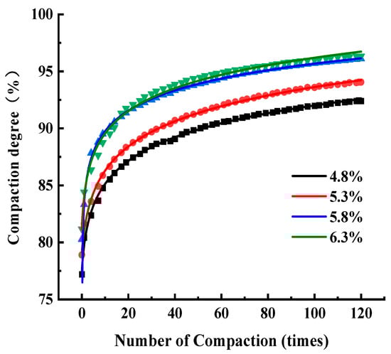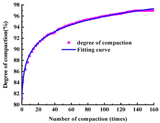 where is the compaction degree of the i-th gyratory compaction of the asphalt mixture, A, B, and C are the fitting coefficients, is the i-th amount of gyratory compaction, and is the corresponding amount of gyratory compaction when the compaction degree is qualified and stable. The average of the fitted data from multiple tests is taken as the value of the fitting coefficients. Based on predictive Equation (9), the compaction degree that varies with the amount of compaction can be estimated, which will greatly reduce the workload of the test parameter calibration and also provide a certain reference point for the on-site prediction of the compaction degree.