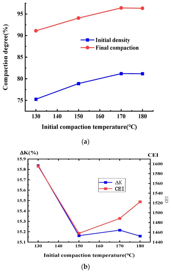 The initial density, final compaction degree, compaction degree increment, and CEI of SMA were measured at different compaction temperatures, and the results are shown in Figure 10.