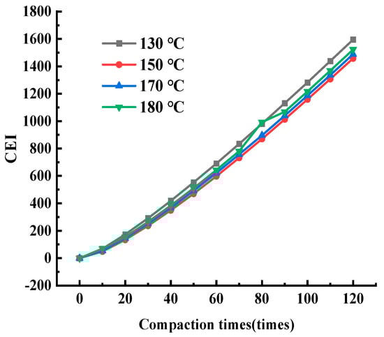 CEI curves based on Formula (12) are shown under different compaction temperatures in Figure 11. The final CEI and compaction degree increments are shown in Figure 10b, and the CEI of the asphalt mixture at different initial temperatures did not change significantly, which indicates the work undertaken to overcome the frictional resistance during compaction. Figure 10a shows that the initial density and the final compaction degree display greater difference when the total amount of compaction is constant.