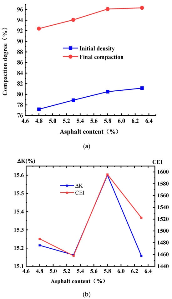 Figure 13 shows that both initial and final compaction increase with increasing asphalt content, and the maximum value of incremental compaction was achieved when the asphalt content was 5.8%. Figure 14 and Figure 13b show that the CEI values of asphalt mixtures at different asphalt contents do not vary significantly, and the work done to overcome the frictional resistance varies comparably during compaction, and the CEI is maximum at an asphalt content of 5.8%, which indicates that the most work is done by gyratory compaction of the asphalt mixture at this asphalt content, the maximum relative displacement is generated between the particles, and the friction-lubrication effect is optimal.