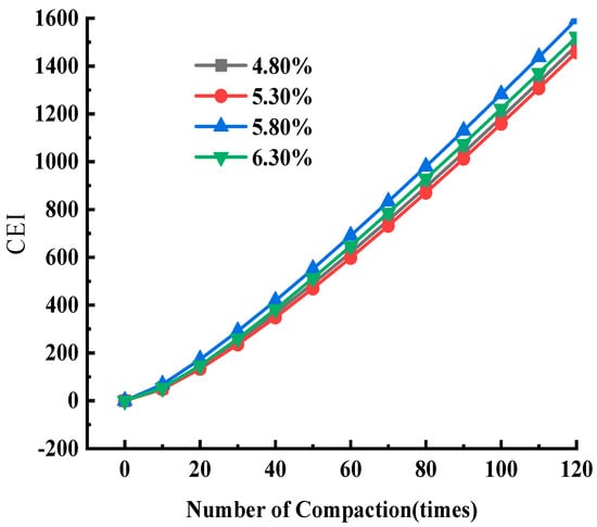 Based on predictive Equation (12), the CEI value with different amounts of compaction can be estimated, which will provide a certain reference point for the on-site prediction of compaction energy.
