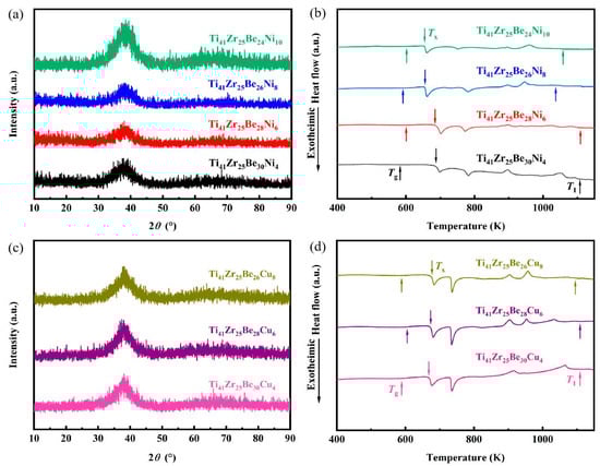 A simple and precise standard, the maximum strain a BMG can undergo in its supercooled liquid state before it eventually crystallizes, was used to characterize the TPF of BMG []. The TPF of Ti41Zr25Be34-xNix and Ti41Zr25Be34-xCux BMG systems characterized by the final diameter D was tested according to the standard. Before testing, the top and bottom surfaces of the Ti-based BMG samples were ground using 2000 grit sandpapers. The BMG specimens were positioned between platens and forced against each other with a constant load of 2000 N, using an OTF-1200X-VHP4 hot-pressing machine (Hefei Kejing Material Technology Co., Ltd., Hefei, Anhui, China). The sample volume was about 0.1 cm3, the starting processing temperature was glass transition temperature Tg, the constant heating rate was 1 K min−1, and the highest processing temperature was chosen as that at which crystallization can still be avoided, in order to maximize the formability during TPF process []. The viscosity of the amorphous alloys in SCLR is a very important parameter, which determines the processing formability []. The viscosity of the samples was determined through thermomechanical analyzer (TMA) analysis to further examine the influence of chemical composition on the TPF of Ti-based BMGs. The geometric dimension of viscosity samples was Φ6 mm × 5 mm. The viscosity tests were performed as a function of temperature in the SCLR using TA Q400 TMA (TA Instruments Inc., Wilmington City, DE, USA) with a 10 K min−1 heating rate and a 1 N static force. The of BMGs was determined according to the following equation, as given in [,]:
