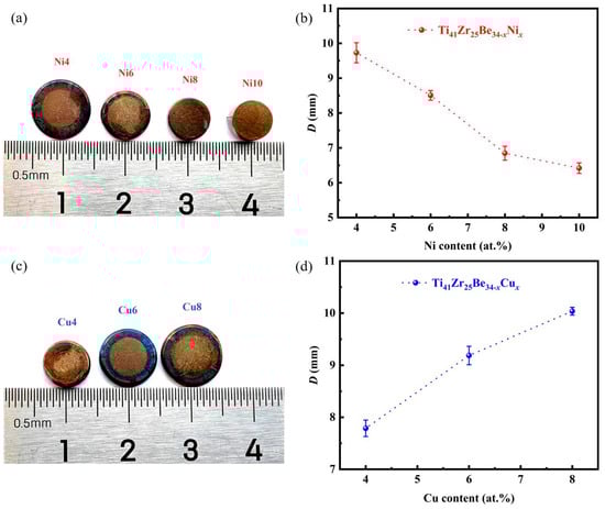 Thermoplastic formability of Ti41Zr25Be34-xNix and Ti41Zr25Be34-xCux BMG series. (a) Top view of the Ti41Zr25Be34-xNix samples after the thermoplastic formability characterization evaluation. (b) Change of D as a function of the Ni content. (c) Top view of the Ti41Zr25Be34-xCux samples after the thermoplastic formability characterization evaluation. (d) Change of D as a function of the Cu content.
