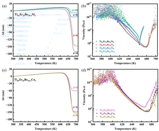 Viscosity as a function of temperature of the Ti-based BMGs. (a) TMA curves of Ti41Zr25Be34-xNix. (b) Measured viscosity of the Ti41Zr25Be34-xNix BMGs in the SCLR. (c) TMA curves of Ti41Zr25Be34-xCux. (d) Measured viscosity of the Ti41Zr25Be34-xCux BMGs in the SCLR.