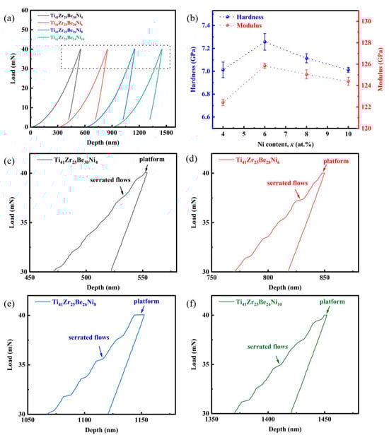 Nanoindentation results of Ti41Zr25Be34-xNix BMG system. (a) Representative P-h curves of Ti41Zr25Be34-xNix BMGs at a constant loading rate of 1 mN s−1; (b) relationship between hardness, modulus, and Ni content; (c–f) a close view of the rectangular dotted zone in Figure 4a.
