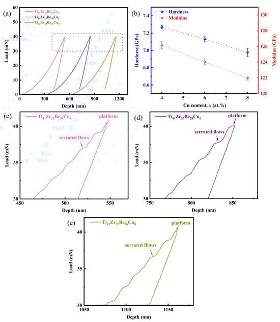 Nanoindentation results of Ti41Zr25Be34-xCux BMG system. (a) Representative P-h curves of Ti41Zr25Be34-xCux BMGs at a constant loading rate of 1 mN s−1; (b) relationship between hardness, modulus, and Cu content; (c–e) a close view of the rectangular dotted zone in Figure 5a.