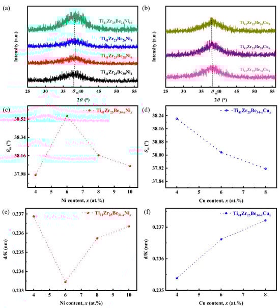Enlarging the maximal diffracted intensity in Figure 1a,c, it can be observed that the angle at maximal diffracted intensity θm of Ti41Zr25Be34-xNix BMGs first increased with the increase in Ni content, reached a peak at Ni6 BMG, and then decreased with an increase in Ni content (Figure 6a). The θm of Ti41Zr25Be34-xCux BMGs decreased with increasing Cu content (Figure 6b). The position of θm was determined through simulation using the Gaussian model. Even though no quantitative analysis of the average atomic distance was tried, the model for diatomic gas introduced by Guinier [] was utilized to monitor the alterations in the relative atomic structure of the studied alloys as their chemical composition changed. Hufnagel et al. [], Caron et al. [], Supriya et al. [], Yang et al. [], Sharma et al. [], and Lv et al. [] also applied this model to study the atomic structural changes in BMGs subjected to elastic stress and established a connection between the atomic distance of a diatomic gas molecule and the Bragg diffraction angle, via the following equation: