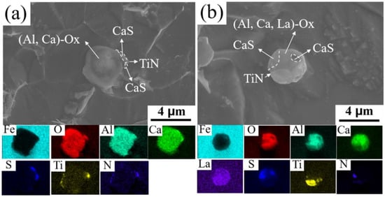 In addition, the shape, size, and distribution of inclusions in microalloyed steels have a significant effect on the material properties [,]. Figure 1b,d illustrate the presence of inclusions with sizes around 3 μm in two microalloyed steels. Since the organization was obtained by corrosion with acidic solution, the full shape of the inclusions obtained could not be observed. To further investigate the effect of rare earth microalloying on the organization, the inclusions were partially exposed by electrolysis of the substrate with non-aqueous solution, and the EDS technique was used to characterize the inclusions in the microalloyed steels, which will be discussed in the next section.