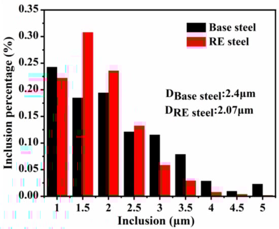 Inclusions have a significant impact on the performance of microalloyed steel, and rare earth elements can effectively modify inclusions [,]. In order to study the effect of rare earths on inclusions, by comparing Figure 3a,b, it can be found that the inclusions in the steel gradually tend to become spherical after the addition of rare earths. Analyzing the composition of inclusions in the microalloyed steel against EDS shows that the inclusions in the base steel consist of (Al, Ca)O oxides as the core, with CaS and TiN attached to the oxides to form the nucleus. The addition of rare earths changes the composition of inclusions. Features such as the number density and particle size of inclusions in microalloyed steels were statistically characterized using the statistical program for inclusions in scanning electron microscopy []. The statistical results, including the number densities and particle sizes of inclusions in the basic and rare earth microalloyed steels, obtained by means of SEM are shown in Figure 4. The overall area during SEM scanning was 27.46 mm2, and the inclusions’ particle size statistics were above 1 μm. Figure 4 reveals that the inclusions in both microalloyed steels are mainly in the range of 1–2.5 μm. The inclusions in the rare earth microalloyed steel have the smaller particle size of 2.07 μm, while the inclusions in the base steel have a particle size of 2.4 μm. In addition, the rare earth microalloyed steel has a higher density of inclusions (13.5/mm2) compared to 10.5/mm2 the base steel. This indicates that the inclusions in the rare earth microalloyed steel are finer and more densely distributed, such that they can effectively pin down the austenite grain boundaries and refine the organization [].