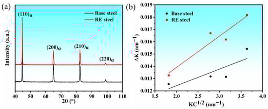 The representative XRD profile (Figure 5a) reveals that the characteristic peaks are mainly shown as four bcc α-Fe peaks ({110}, {200}, {211}, and {220}) of the matrix organization. Detailed XRD peak profiling was utilized to determine the dislocation density in Figure 5b according to the modified Williamson–Hall (MWH) method (Equation (2)) [,]. The results indicate that the dislocation density is 3.15 × 1014 m−2 in the base steel and 3.31 × 1014 m−2 in the rare earth microalloyed steel, suggesting that the addition of rare earths has an effect on the dislocation density in the steel.