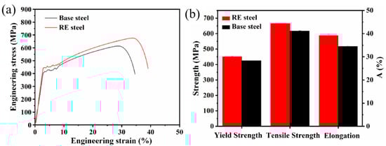 Figure 7b indicates that the yield strength, tensile strength, and elongation of the matrix steel were 425.1 ± 6.2 MPa, 610.4 ± 11.3 MPa, and 34.6 ± 0.8%, respectively. In contrast, the yield strength, tensile strength, and elongation of the rare earth microalloyed steel reached 450 ± 6.0 MPa, 679.6 ± 5.9 Mpa, and 39.1 ± 1.0%, respectively, indicating that the addition of rare earth elements increased the yield strength, tensile strength, and elongation of the steel [].