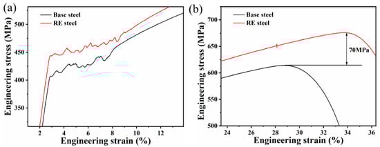 Figure 7a presents the engineering stress–strain curves of the matrix steel and the rare earth microalloyed steel at room temperature. From Figure 7a, it can be seen that the tensile curves of both steels start from the elastic region and then reach the yield point. After these different upper and lower yield points, the tensile curves show complex rheological behavior. The shape of this region (the Lüders region []) varies depending on the steel under study. The phenomenon of the yield point in tensile testing is often referred to as the Lüders effect, through which the plastic deformation zone is regarded as the Lüders zone []. After traversing the Lüders band, the curve persists in its typical behavior, the stress level progressively increasing until it attains the pinnacle referred to as the ultimate tensile strength (UTS). After that, the stress level decreases during the necking process until it finally fractures.