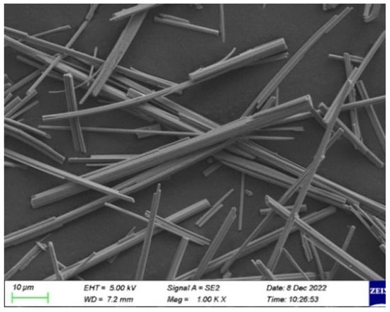 The CSWs, manufactured by a Shanghai-based company (refer to Figure 1), exhibited an averaged aspect ratio of 120. The surfactant used for the CSW was sodium hexametaphosphate (SHMP), depicted in Figure 2. The primary performance parameters of the CSW are summarized in Table 1, and their scanning electron microscopy (SEM) image is provided in Figure 3. Short-cut BFs, produced by a Zhejiang Province fiber joint-stock company (illustrated in Figure 1), had their key performance metrics detailed in Table 2.