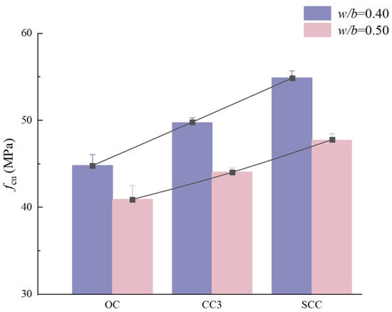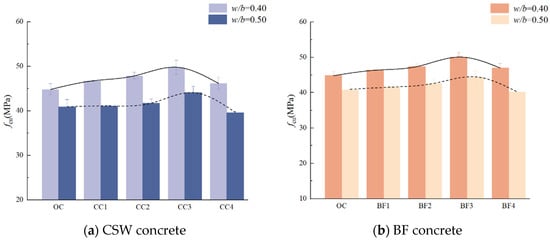 Compressive strength of CSW and MCSW concrete with different w/b ratios.
