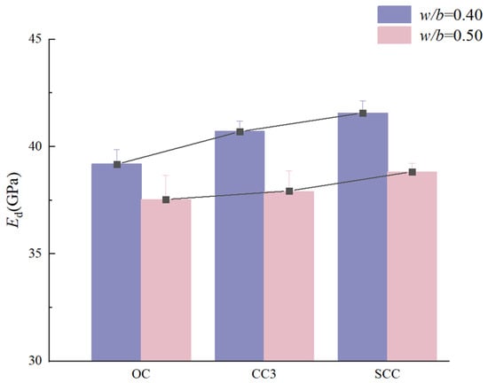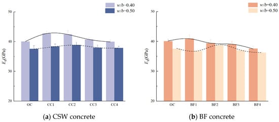 Dynamic elastic modulus of CSW and BF concrete with different w/b ratios.