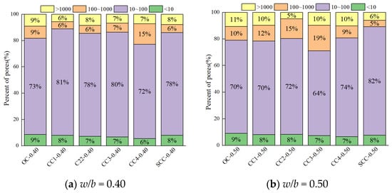 Figure 8 and Figure 9 illustrate the pore size distribution, designating four distinct pore size regimes for analysis. Transitional pores, spanning 10–100 nm, predominate the pore size distribution, composing roughly 70% of the total porosity. The smallest fraction, gel pores less than 10 nm, contributes to about 8% of the porosity. The proportions of macropores and capillary pores are considerably smaller than transitional pores. A higher w/b ratio (0.50) markedly increases the proportions of macropores and capillary pores, implicating them as principal factors in the rise of total porosity [].