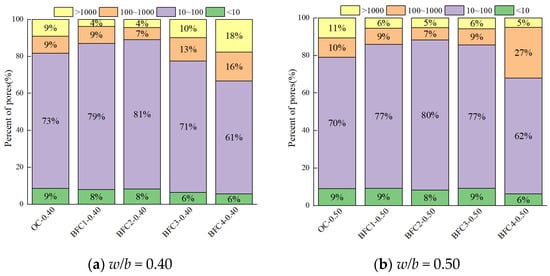 Figure 9 reveals that BF content does not significantly impact gel pore proportions; however, the combined proportion of larger pores initially decreases and then increases. Excessive BF addition poses dispersion challenges, leading to reduced bonding performance, enhanced weak interfaces, and a consequent increase in macropores, which adversely affects the concrete’s density and mechanical performance [].