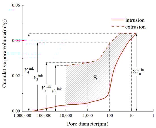 The hysteresis loop area (S), enclosed by the mercury intrusion and extrusion curves, indicates the prevalence of ink-bottle pores within the concrete structure []. The cumulative volume of mercury intrusion, denoted by ΣVnin, and the ink-bottle pore volume, represented as Vnink, n = {1,2,3,4}, are computed for different pore size ranges utilizing Equations (5) and (6) []. Correspondingly, ΔVnink, n = {1,2,3,4} reflects ink-bottle pore volumes across various pore sizes, including gel pores, transition pores, capillary pores, and macropores.