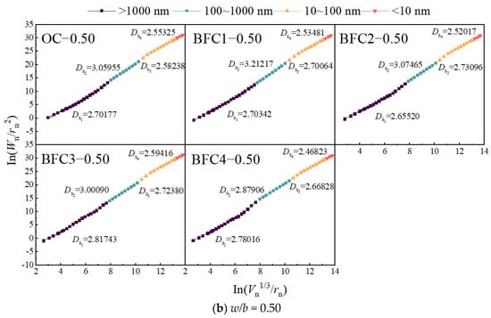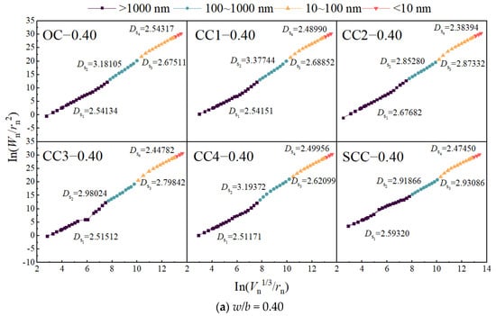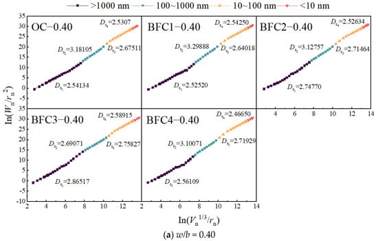 Ds embodies concrete’s internal pore structure and is deduced from the slope of an In-In plot crafted using Equation (4). This dimension reflects the fractal nature, size-dependence, and multifractal characteristics of concrete’s pore distribution and shape diversity [,]. Figure 11 and Figure 12 categorize pore characteristics by size: gel pores (<10 nm), transition pores (10–100 nm), capillary pores (100–1000 nm), and macropores (>1000 nm).