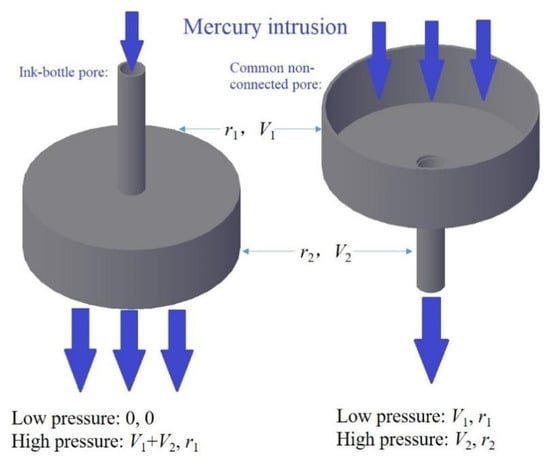 Figure 13 schematically represents ink-bottle pores alongside typical non-communicating pores. The diagram illustrates the mercury intrusion direction, with V1 and V2 quantifying mercury volumes at varying pressures, and r1 and r2 signifying the corresponding pore sizes. MIP tests for conventional semi-open pores register a cumulative volume increase from V1 to V1+V2 and a pore size expansion from r1 to r2 with escalating mercury pressure. In contrast, ink-bottle pores necessitate sufficient mercury pressure to log the cumulative volume V1+V2 while only recording a pore size of r1 []. Consequently, ink-bottle pores tend to exhibit a larger cumulative mercury volume at pore size r1, raising the potential for surface fractal dimensions surpassing three.