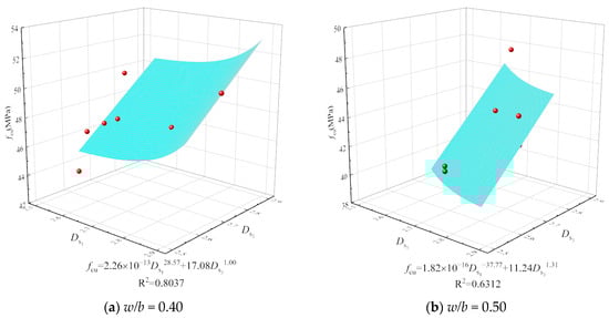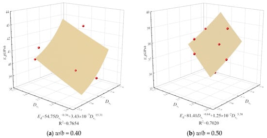 The surface fractal dimension’s positive correlation with dynamic modulus of elasticity and compressive strength demonstrates that a higher fractal dimension equates to an enhanced ability to distribute stress within the concrete’s internal structure, uplifting compressive strength []. The dynamic modulus is affected by the microstructure and the properties of the aggregate and cement paste materials []. When partially connected pores are replaced by smaller pores, increasing the surface area, the surface fractal dimension also rises. Furthermore, data from Figure 11 and Figure 12 suggest that the correlation between surface fractal dimension and mechanical properties is weaker for concrete with a higher w/b ratio of 0.50 than for a lower ratio of 0.40, owing to a higher total porosity and reduced impact of capillary pores.