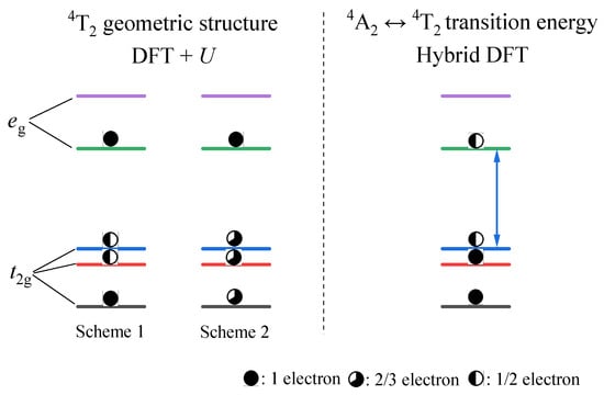 Slater’s transition-state method [30,31] was employed to estimate the 4A2-4T2 excitation and emission energies, respectively, at the equilibrium geometric structures of the ground 4A2 and excited 4T2 states. This process involves examining the disparities in energy between the lowest eg and highest t2g KS orbitals in the density of states (DOS) diagrams obtained from such calculations based on the single-electron configuration t2g2.5eg0.5, as depicted in Figure 1. The associated zero-phonon line (ZPL) energy can be readily determined by applying the Franck–Condon principle. Additionally, the Stokes shift energy can be calculated by evaluating the difference between the excitation and emission energies of the corresponding optical transitions.