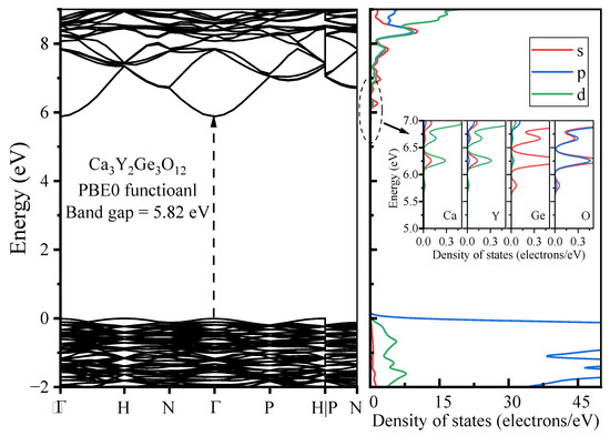 The band structure, along with the DOSs, were computed for pristine Ca3Y2Ge3O12 utilizing the PBE0 functional, taking into account the optimized geometric structure of the host, as illustrated in Figure 4. The calculated band gap displays a direct character and measures 5.82 eV, marking a significant improvement compared to the result of 3.32 eV obtained with the PBE functional. This closely aligns with the experimentally determined optical band gap of the host (5.71 eV), determined through the Kubelka–Munk function and the Tauc relation applied to the measured diffuse reflection spectra [8]. The top of the valence bands (VBs) appears relatively flat, similar to other oxygen-based garnets [35], while the bottom of the conduction bands (CBs) exhibits notable dispersion, with a single CB dipping down at the Γ point. This observation strongly suggests high electron mobility in the CBs and the localization behavior of holes in the VBs. The calculated DOS diagrams provide further insight into the composition of the band edges. The VBs’ top is predominantly influenced by the O-2p orbitals, whereas the CBs’ bottom is primarily composed of the Ca-3d, Y-4d, Ge-4s, and O-2sp orbitals.