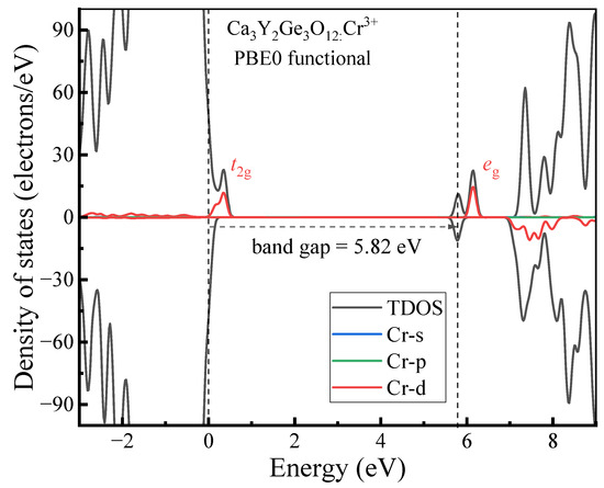 Figure 5 depicts the DOS diagrams of Cr3+-doped Ca3Y2Ge3O12, obtained from the PBE0 calculations using the optimized geometric structure when Cr3+ ions occupy the Y3+ sites. As anticipated, new states associated with the Cr-3d orbitals emerge within the band gap. The lower Cr-3d-t2g KS orbitals with spin up are observed to subtly split into two bands, positioned slightly above the top of the VBs. Meanwhile, the higher Cr-3d-eg KS orbitals with spin up, localized in the CBs, remain as one band without any observable splitting. The calculated results fully align with the fundament knowledge in group theory: the triply degenerate t2g transforms into a single-fold A and a doubly degenerate E, whereas the doubly degenerate eg is maintained as E when Cr3+ ions occupy the Y3+ octahedral sites with the point group symmetry S6 [36]. All the Cr-3d KS orbitals with spin down are deeply buried into the CBs.