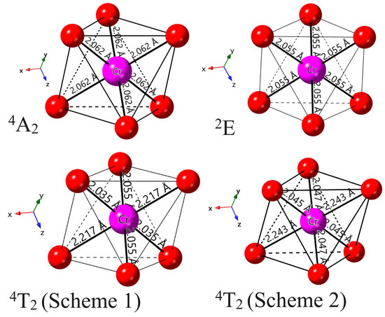The equilibrium geometric structures of the excited states 2E and 4T2 of Cr3+ ions in Ca3Y2Ge3O12 were determined using the ΔSCF technique with the PBE+U method, as illustrated in Figure 6. In the case of the excited state 2E, the calculated local coordination environment of Cr3+ ions maintains the initial point group symmetry of S6, with a slight bond length contraction of 0.007 Å in comparison to its ground state 4A2. This minor change is anticipated since the 2E state is not associated with an orbital change but rather a spin flip when compared to 4A2. In contrast, the optimized equilibrium geometric structures of the excited state 4T2, utilizing two sets of fractional particle occupancy schemes tailored for the calculation convergence issues mentioned in the computational methodology section, undergo a significant Jahn–Teller distortion, resulting in a symmetry descent from S6 to its subgroup Ci. This distortion involves a notable axial expansion (at least an increase of 0.15 Å) and a slight equatorial compression in the [CrO6]9− complex. And the Cr3+-O2− bond lengths, initially identical, split into three groups. These calculation results align with semi-empirical CF analyses on the Jahn–Teller effect for 3d ions in solids [37]. Additionally, we considered the volume of the [CrO6]9− complex as an index to characterize the distortion level of the excited state 4T2 with respect to the ground state 4A2. The calculated results of 11.6742 (4A2), 12.3496 (Scheme 1 for 4T2), and 12.5107 (Scheme 2 for 4T2) Å3 on this parameter indicate a potential over-relaxation risk in the equilibrium geometric structure obtained from the second fractional particle occupancy scheme, or an under-relaxation case for Scheme 1 (which will be discussed later).