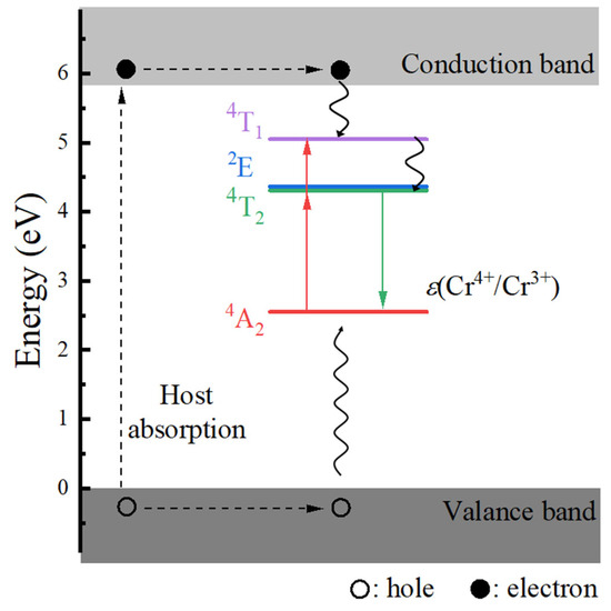 To understand the luminescence mechanism of the materials under investigation, we constructed a host-referred binding energy (HRBE) diagram for Cr3+-doped Ca3Y2Ge3O12 following Dorenbos’s standardization [38], as illustrated in Figure 7. The energy level position of the ground state 4A2 of Cr dopants within the band gap was determined by employing the charge transition level ε(+1/0) (denoted as ε(Cr4+/Cr3+)), derived from the PBE0 total energy calculations. Simultaneously, the positions of the excited states 2E, 4T2, and 4T1 were ascertained by considering their calculated ZPL energies relative to the ground state 4A2. It is worth noting that the estimation of the 4A2-4T1 ZPL energy involves the energy difference between the two experimentally observed 4A2-4T2 and 4A2-4T1 excitation energies (i.e., ~0.72 eV taken from reference [8]). Inspection of Figure 7 reveals three distinct excitation pathways that induce the luminescence: host absorption from VB to CB and the 4A2 → 4T1 and 4A2 → 4T2 transitions of Cr3+ dopants. Evidently, the excitation efficiency of the host absorption is the lowest, given the considerable separation of the ground 4A2 and luminescent 4T2 energy levels from the top of the VBs and the bottom of the CBs, respectively. The isolated nature of the luminescence, free from the interference of the host’s electronic structure, also ensures potentially excellent quantum efficiency for applications in NIR light sources. Both anticipated observations are substantiated by the experiments (refer to Figure 4 and see Section 3.4 in reference [8]).