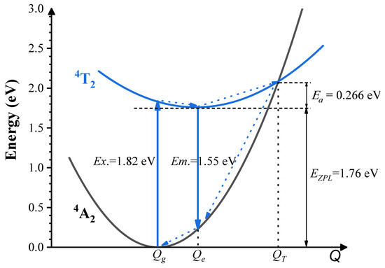 The luminescent energy level observed in the investigated compound has been attributed to the excited state 4T2 of Cr3+ dopants. Consequently, the thermal quenching effect in Cr3+-doped Ca3Y2Ge3O12 arises primarily from the thermally activated crossover between the potential surfaces of the ground 4A2 and excited 4T2 states [39]. It is crucial to note that the crossover between the potential surfaces of the ground 4A2 and excited 2E states appears challenging due to a nearly negligible change in configuration coordinates relative to the ground state 4A2. The thermal excitation energy (Ea) of Ca3Y2Ge3O12: Cr3+, a pivotal parameter for describing the thermal stability of materials, can be defined as the energy difference between the crossover point of the potential surfaces of the ground 4A2 and excited 4T2 states and the equilibrium structure point of the excited state 4T2. To evaluate Ea, we constructed a configuration coordinate diagram of Cr3+ ions in Ca3Y2Ge3O12. This involved considering the equilibrium structure points of the ground 4A2 and excited 4T2 states (denoted as Qg and Qe, respectively), utilizing the calculated excitation, emission, and ZPL energies of the optical transition 4A2-4T2 (denoted as Ex., Em. and EZPL, respectively), and applying a one-dimensional harmonic approximation for the potential surfaces of the ground 4A2 and excited 4T2 states, as illustrated in Figure 8.