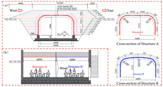 The design of the two full-scale models refers to the clearance requirements for bridges over rural roads in the JTG D60-2015 [23]. The horizontal and vertical clearance of the two full-scale models are 6 and 4 m, respectively. The span, rise, and sidewall height of the two full-scale models are 6.6, 3.7, and 2.33 m, respectively, as shown in Figure 1a. The difference between the two full-scale models is the radius of the crown and haunch. One of the models has an infinite crown radius (the crown of the structure is flat) and a haunch radius of 1.4 m, which will be called Structure A. The other model has a crown radius of 12.9 m and a haunch radius of 1.2 m, which will be called Structure B. The two full-scale models are made of deep corrugated steel plates (CSP) with 381 mm pitch, 140 mm depth, and 6 mm thickness. The yield strength and elasticity modulus of the CSP are 355 MPa and 206 GPa. The length of both models is 6.1 m. The CSP, foundation, and backfill of the two models are separated from each other. The gaps between the CSP of the two models are covered with thin steel plates, and the backfills are separated wooden boards, as shown in Figure 1b. The two models were backfilled synchronously. Gravelly sand is used for backfilling within 50 cm on both sides of the sidewall and 0.3 m above the crown, and the remaining areas are backfilled with sandy silt. Backfill around the structures is placed in lifts of 30 cm thick layers and then compacted to 95–100% optimum density according to standard proctor test in compliance with the construction requirements of AASHTO [5] and the CHBDC [6].