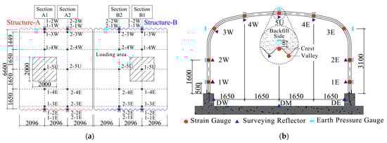 The performance of the structure was monitored by surveying points at two transverse sections within each structure located at the third point of the bridge length (Figure 2a). Section A1 and B1 were the main test sections, and section A2 and B2 were the control sections. The displacement and strain measurement points of section A/B-1 were arranged at the crown, haunch, 1/4 of the span, and the position of 1.6 and 0.5 m above the foot of the sidewall, as shown in Figure 2b. The control sections A2 and B2 lacked unimportant measuring points 4E and 1E compared to the main test sections A1 and B1. In addition, the displacement of the foundation was measured through the measuring points on the middle and side walls of the foundation. The displacement of the structure was measured by using a Keda Total Station 442R10, Guangdong Southern Era Technology Co., Ltd., Guangzhou, China which provides a distance accuracy of 1 mm. The surveying reflectors were attached to the valley of the CSP and the surface of the foundation, as shown in Figure 3a.