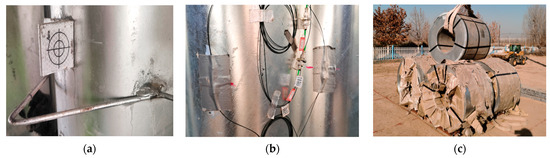 The displacement, strain, and earth pressure of the two models during backfilling were monitored after each backfill layer was placed on both sides of the CSP. When backfilling to 30, 60, and 90 cm above the crown, the loading tests were performed on Structures A and B using the steel strip coils, as shown in Figure 3c. The loading weights were determined to be 170, 240, and 280 kN, according to the axle weight of the design truck and the load factor in JTG D60-2015 [23]. Moreover, 170 kN is the rear axle load 140 kN of the design truck multiplied by the load factor 1.2. Furthermore, 240 kN and 280 kN are respectively twice the middle and rear axle load of the design trucks. A square pallet with a width of 2 m was set under the coils.