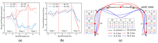 Figure 4a shows the horizontal deformation of measuring points 2W and 2E during the backfilling process. Figure 4b shows the vertical deformation of measuring points 4W and 5U. The deformation shown in Figure 4 has been subtracted from the foundation settlement. According to the deformation law of the structure during backfilling, the backfilling process is divided into three stages. Stage 1 is backfilling to 1.5 m above the arch foot (backfilling to measuring points 2W and 2E); stage 2 is backfilling to 3.3 m above the arch foot (backfilling to the haunch); and stage 3 is backfilling to 90 cm above the crown, as shown in Figure 1a. Figure 4c shows the overall deformation of Structures A and B at the end of stages 2 and 3.