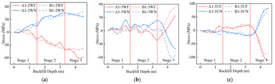The stresses of Structures A and B during backfilling: (a) 2W; (b) 3W; (c) 5U.