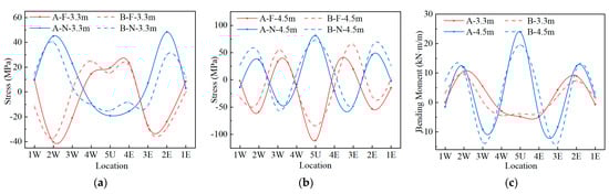 The stresses and bending moments of Structures A and B during backfilling: (a) stress when backfilling to 3.3 m; (b) stress when backfilling to 4.5 m; (c) bending moment when backfilling to 3.3 and 4.5 m.