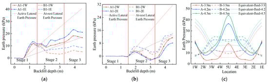 The earth pressure of Structures A and B during backfilling: (a) 1W, 1E; (b) 2W, 2E; (c) earth pressure distribution.