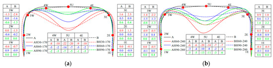 Figure 8a shows the deformation of the structure under a 170 kN load. Figure 8b shows the deformation of the structure under 240 and 280 kN loads. It can be seen from Figure 8 that the vertical deformation of the crown of Structure A is greater than that of Structure B under the same load and cover depth and is 1.1 to 2 times that of Structure B. The crown deformation of Structure B under live load is relatively gentle. Under the same load, the haunch horizontal deformation of Structure A is smaller than that of Structure B, and the soil–steel interaction of Structure B is more intense. It can be seen from Figure 8a that the vertical deformation under the same load decreases with the increase in cover depth. The live load diffusion area increases with the increase in cover depth. This limits the transformation of the structure from vertical deformation to horizontal deformation, and the difference in horizontal deformation decreases as cover depth increases.