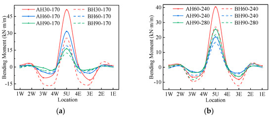 The bending moments of Structures A and B under live load: (a) 170 kN; (b) 240, 280 kN.