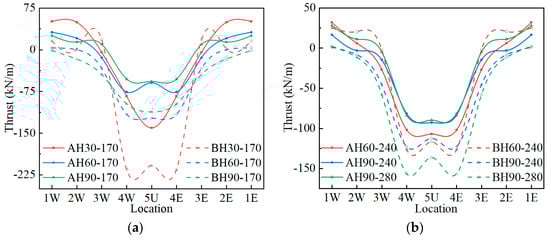 The thrust of Structures A and B under live load: (a) 170 kN; (b) 240, 280 kN.