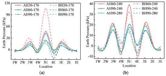 The earth pressure of Structures A and B under live load: (a) 170 kN; (b) 240, 280 kN.