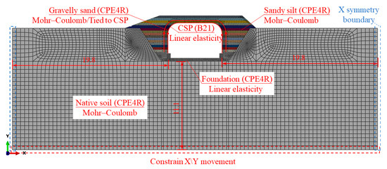 For improving computational efficiency, 2D FEMs (as shown in Figure 12) were established by the ABAQUS 2020 software to obtain the performance of the BTSSS during the backfilling process and under the live load [25,26,27]. The native soil was extended to three times the span of the BTSSS, and symmetric boundary conditions (Ux = URy = URz = 0) were imposed [28]. The distance from the bottom boundary of the native soil to the foundation was taken as 11.1 m, about three times the rise of the BTSSS, and all degrees of freedom of the nodes on the bottom boundary were fixed. The two-node liner beam elements (B21) were used to simulate the CSP. The other parts in the FEM were simulated by four-node bilinear plane strain quadrilateral reduced elements (CPE4R).
