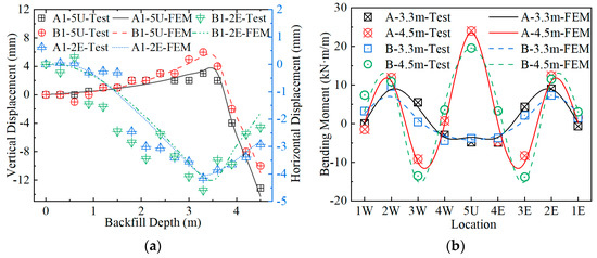 Comparisons of test data and FEM results during backfilling: (a) deformation; (b) bending moment.